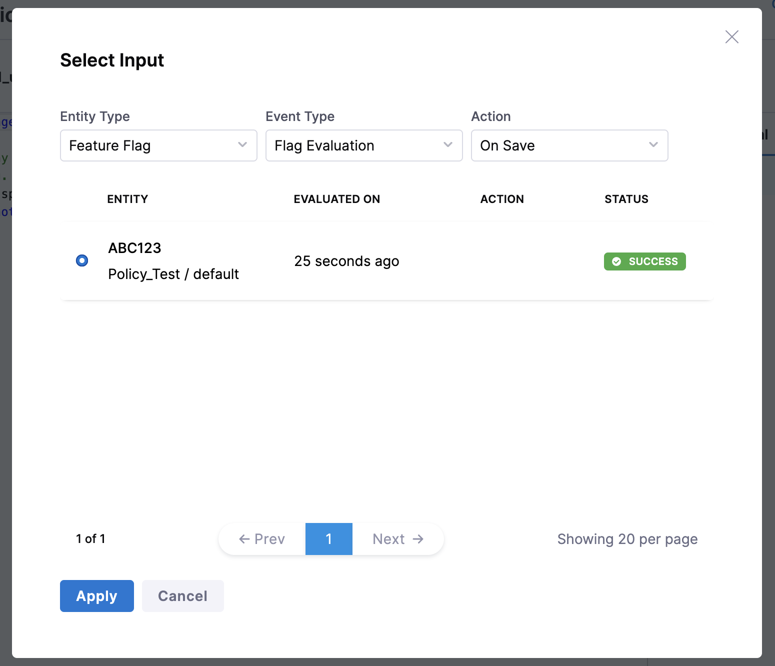 Select the Feature Flag you want to test, then click Apply. This will automatically populate the Testing Terminal using the details of the Feature Flag you selected.